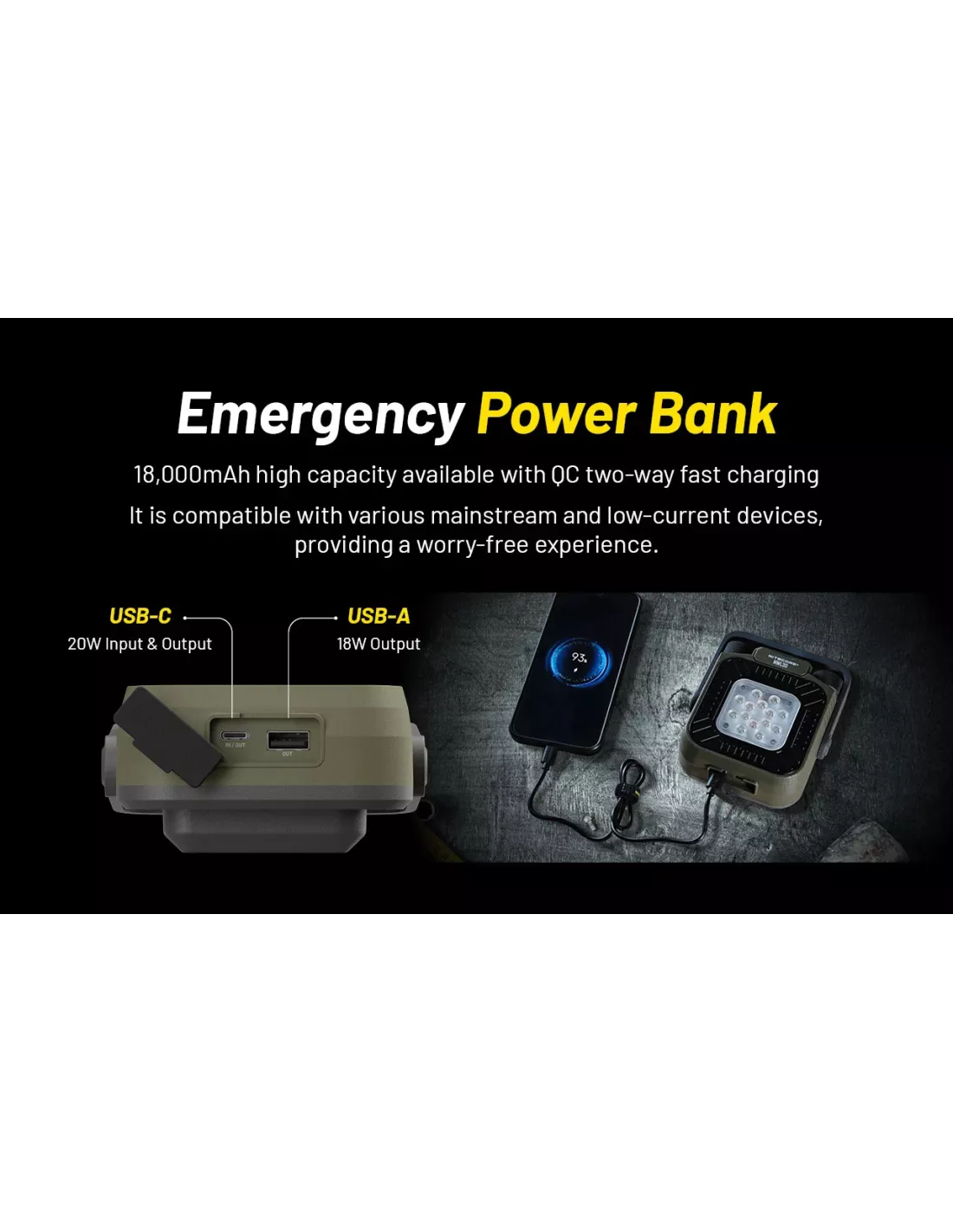 Beyond lighting, the NWL30 also functions as a powerful emergency power bank. Its built-in 18,000mAh battery supports QC two-way fast charging and includes both USB-C and USB-A ports, allowing you to charge multiple devices such as phones, headlamps, GPS units, smartwatches, and other electronics. It also supports low-current devices, which is especially useful for items like wireless earbuds and wearables. On its lowest lantern setting, the NWL30 can run for up to 130 hours, and it fully recharges in approximately 3.6 hours.
