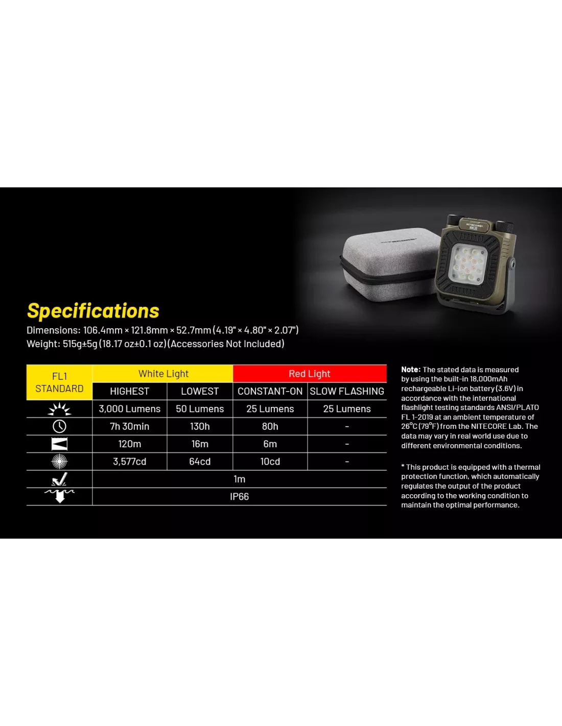 With a maximum output of 3000 lumens and a beam distance of up to 131 yards, the NWL30 provides strong and practical illumination for campsites, work areas, shelters, vehicles, and outdoor tasks. It features two white light brightness levels as well as two red light modes, making it useful not only for area lighting but also for signaling and preserving night vision.