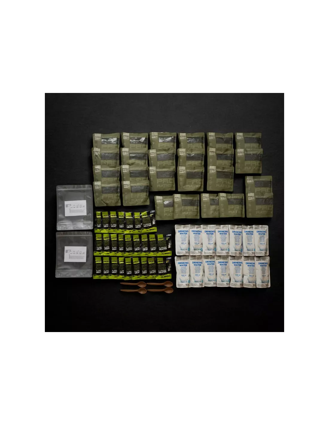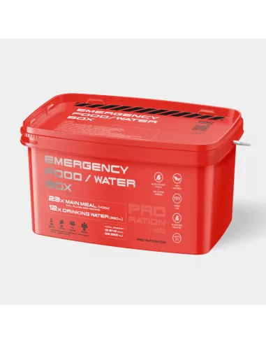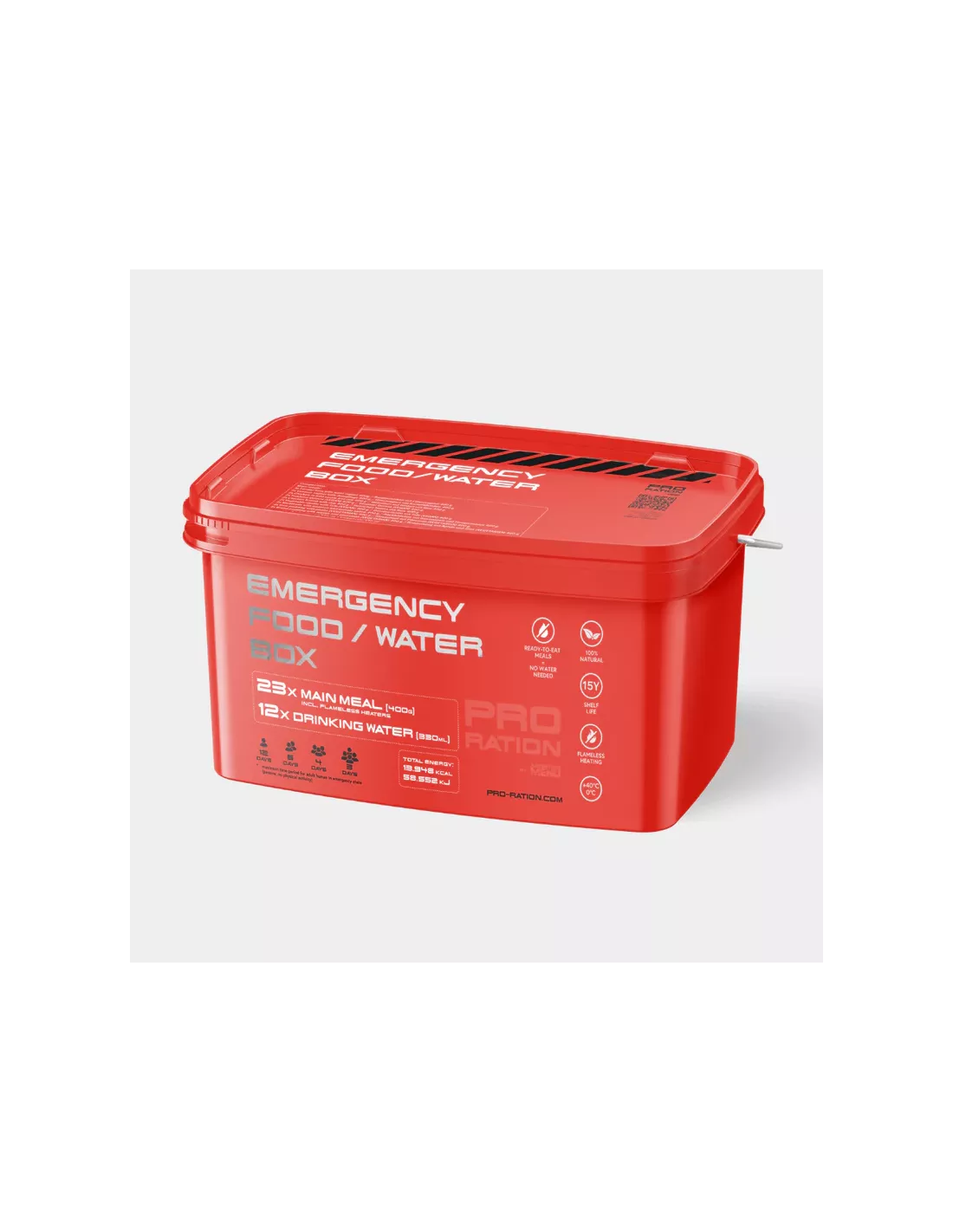 The Pro Ration Emergency Food & Water Box combines 23 portions of 100% natural ready meals (15-year shelf life) with 12× long-lasting 330 ml drinking water packs (50-year shelf life), plus 23 flameless heaters for safe hot meals without fire, gas, or a stove. Compact, durable, and easy to store, it’s ideal for families, organizations, home emergency supplies, field operations, and disaster readiness.