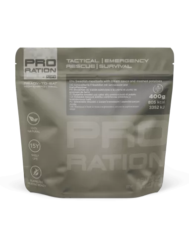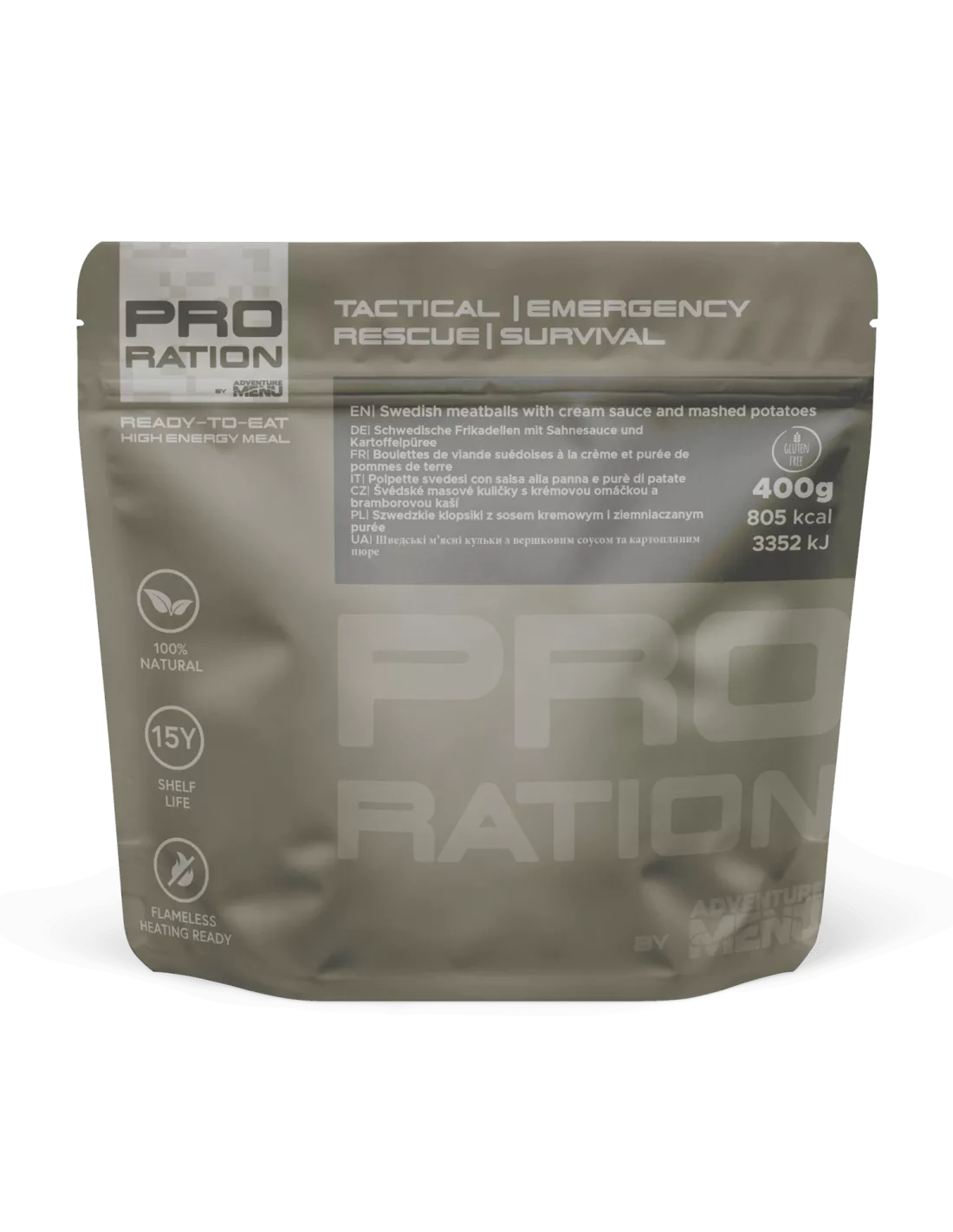Swedish Meatballs with Cream Sauce & Mashed Potatoes delivers a rich, satisfying meal with creamy mashed potatoes (38%), a smooth cream sauce (34%), and hearty meatballs (24%) made from a flavorful beef & pork blend with herbs and warm spices. Finished with cranberries (4%) for that traditional sweet-tart touch, it’s a filling, high-energy option for demanding days outdoors, training, or long-term storage.