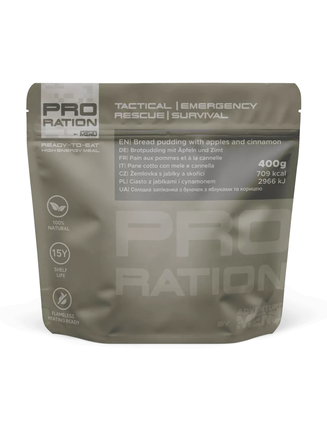 Bread Pudding with Apples & Cinnamon blends French bread (25%) with apples (22%), milk, curd cheese, butter, and egg for a rich, satisfying pudding-style dish. Lightly finished with cinnamon, it’s an ideal breakfast option, morale boost dessert, or quick energy meal for outdoor trips and long-term storage.