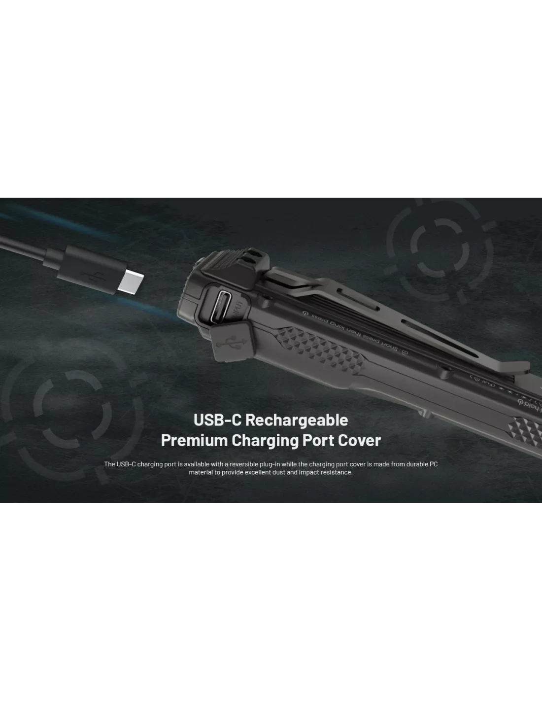 The built-in USB-C charging port allows for fast and convenient recharging, with full charging completed in just over one hour. Integrated power indicators keep you informed of battery status, and on its lowest setting the flashlight can run for up to 55 hours.