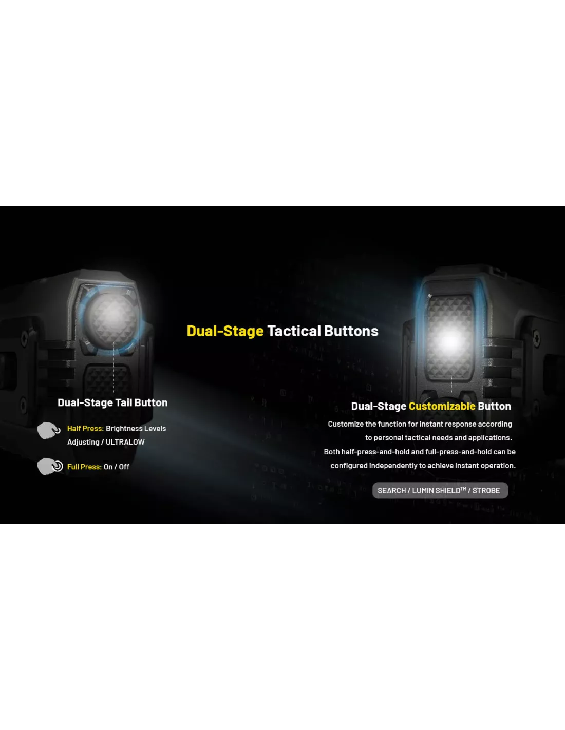 A built-in digital OLED display gives the flashlight a modern and highly practical interface, clearly showing brightness level, remaining battery life, and other important information at a glance. The flashlight also features two dual-stage tactical buttons for intuitive operation. The circular tail button controls power, brightness, and momentary ultralow mode, while the rectangular customizable button can be set for quick access to Spotlight, Floodlight, or Strobe, depending on user preference.