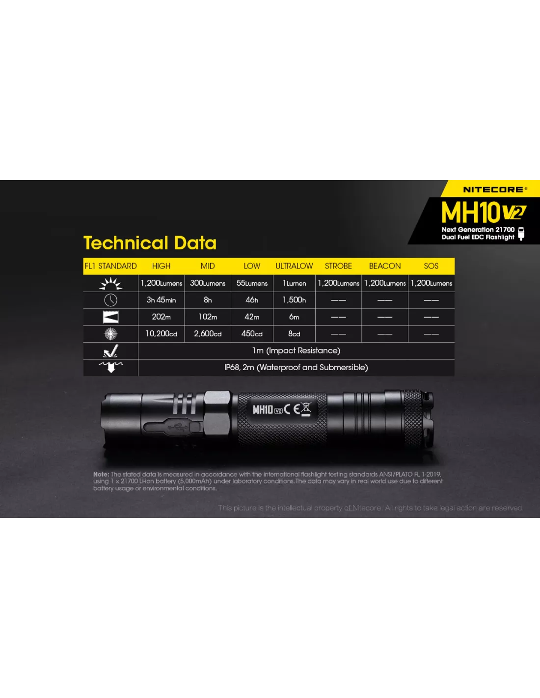 Nitecore MH10 v2 is a rechargeable flashlight with 1200 lumens, USB-C fast charging, 21700 battery, IP68 waterproof protection, and up to 1500 hours runtime.