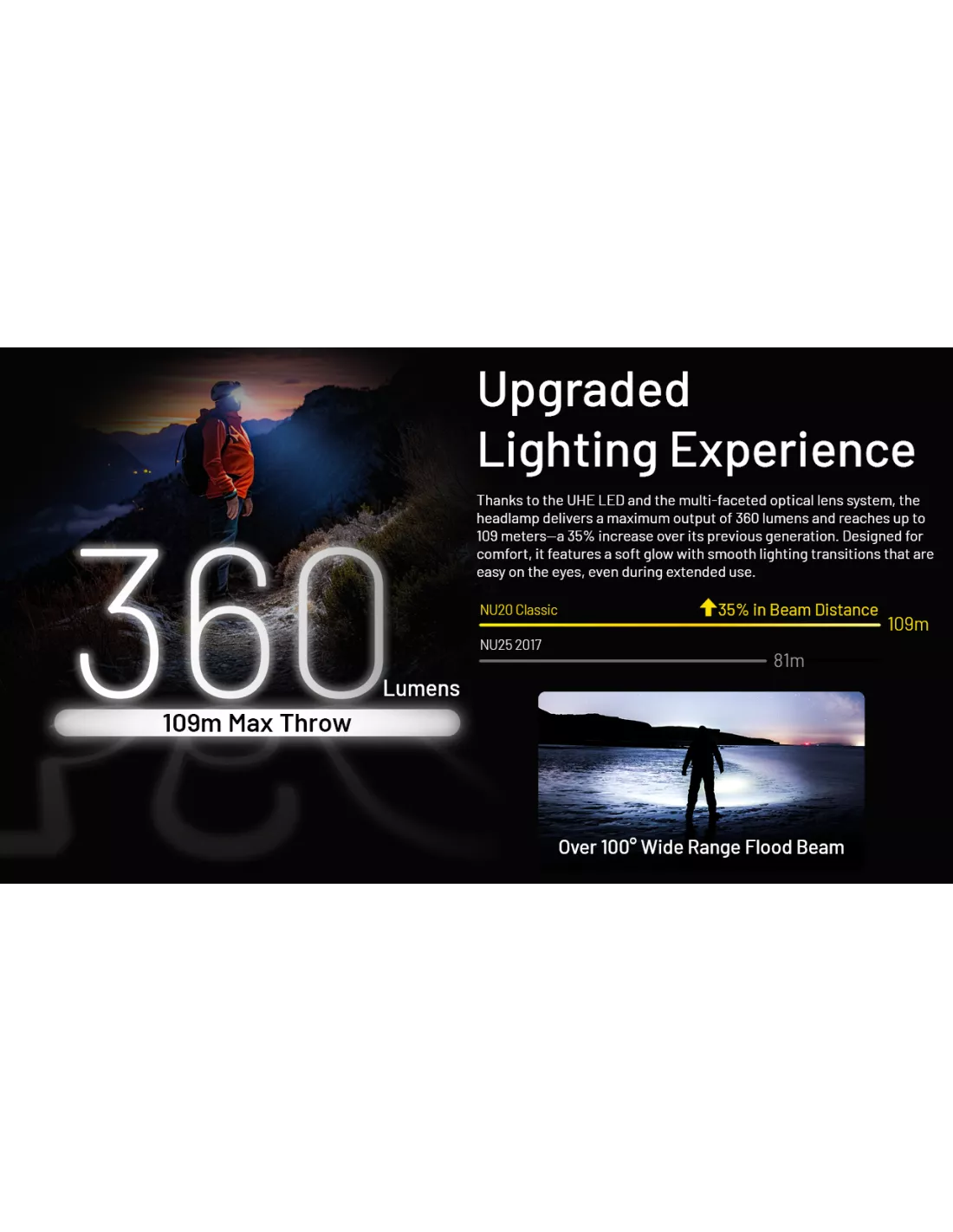 The Nitecore NU20 is a lightweight, compact, and rechargeable LED headlamp built for outdoor adventures, everyday carry, work, camping, hiking, trail running, and general hands-free use. With a maximum output of 360 lumens, a beam distance of 109 meters, and multiple lighting options, it offers excellent performance in an ultra-portable design.