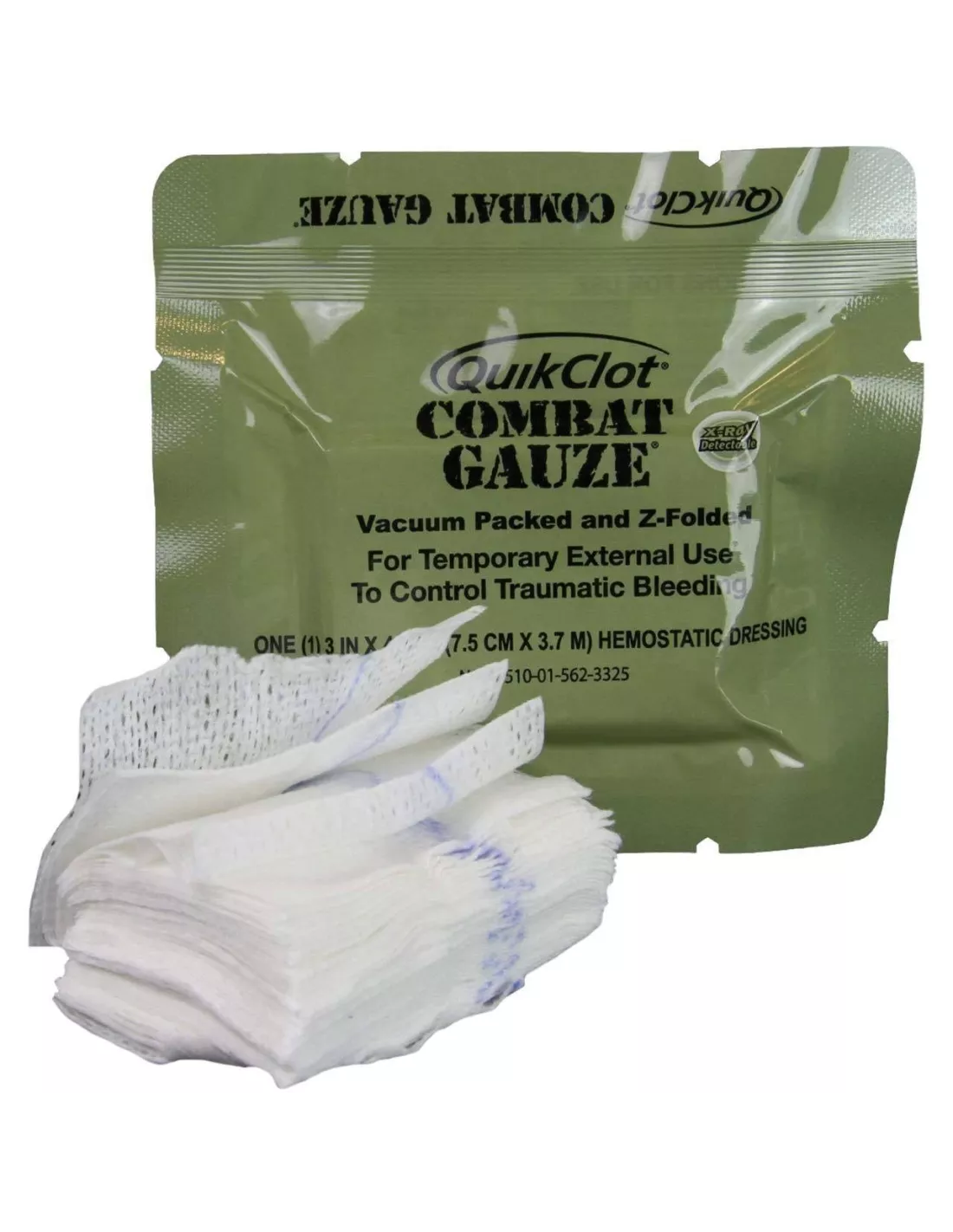 The QuikClot Combat Gauze Z-Fold is even easier to apply since the gauze is in a z-fold format, which makes packing wounds easier and eliminates the risk of the roll falling away and getting contaminated. The vacuum packed feature of the QuikClot Combat Gauze Z-Fold makes it much more compact, saving room on your body. Finally, the x-ray detectable strip that is incorporated in the QuikClot Combat Gauze Z-Fold ensures that the gauze will be found if the patient is taken to the operating room.