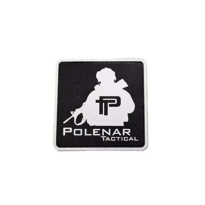 Our PVC patch with a white Polenar Tactical logo and trim on a black background with 3D hexagons.