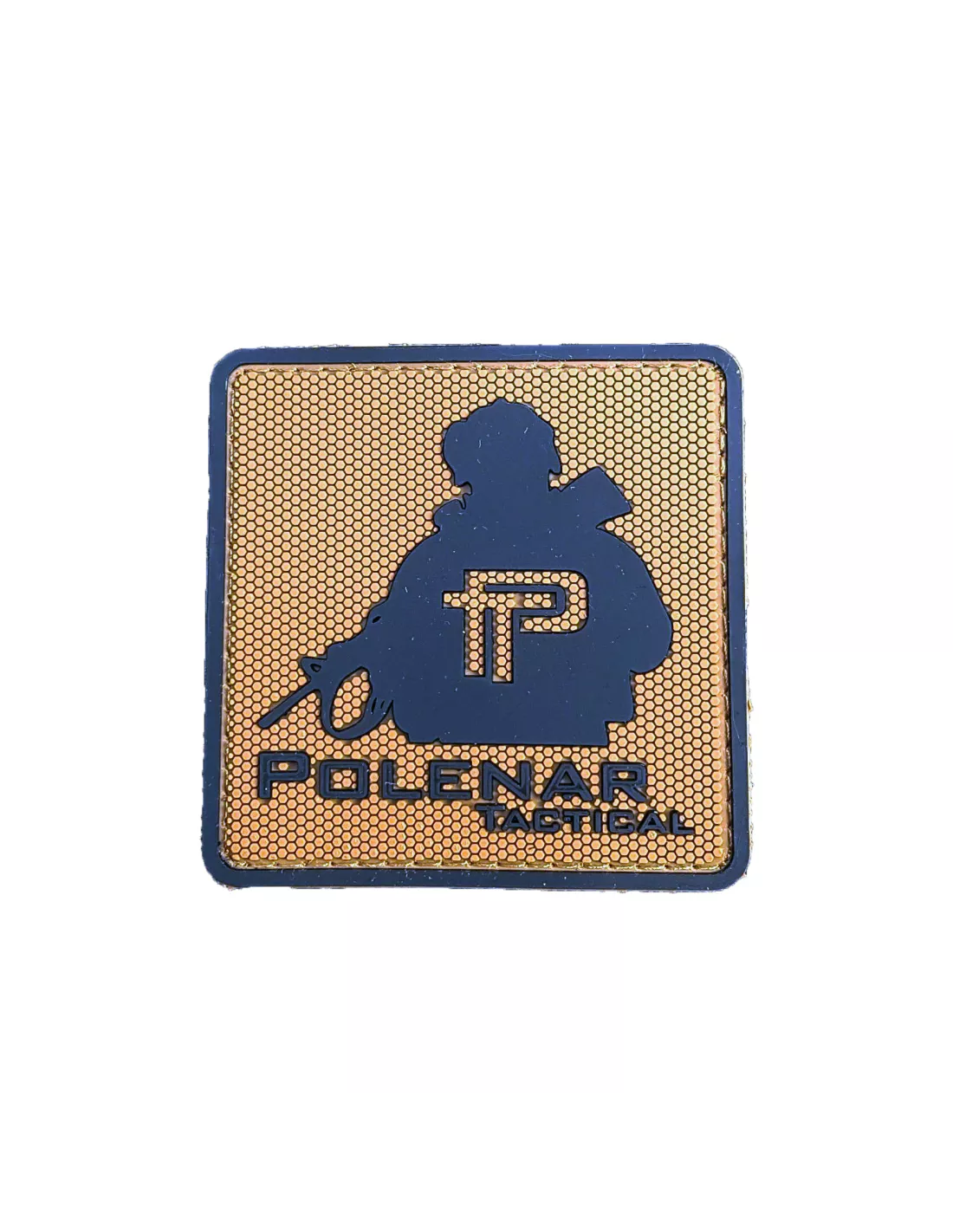 Our PVC patch with a white Polenar Tactical logo and trim on a coyote background with 3D hexagons.