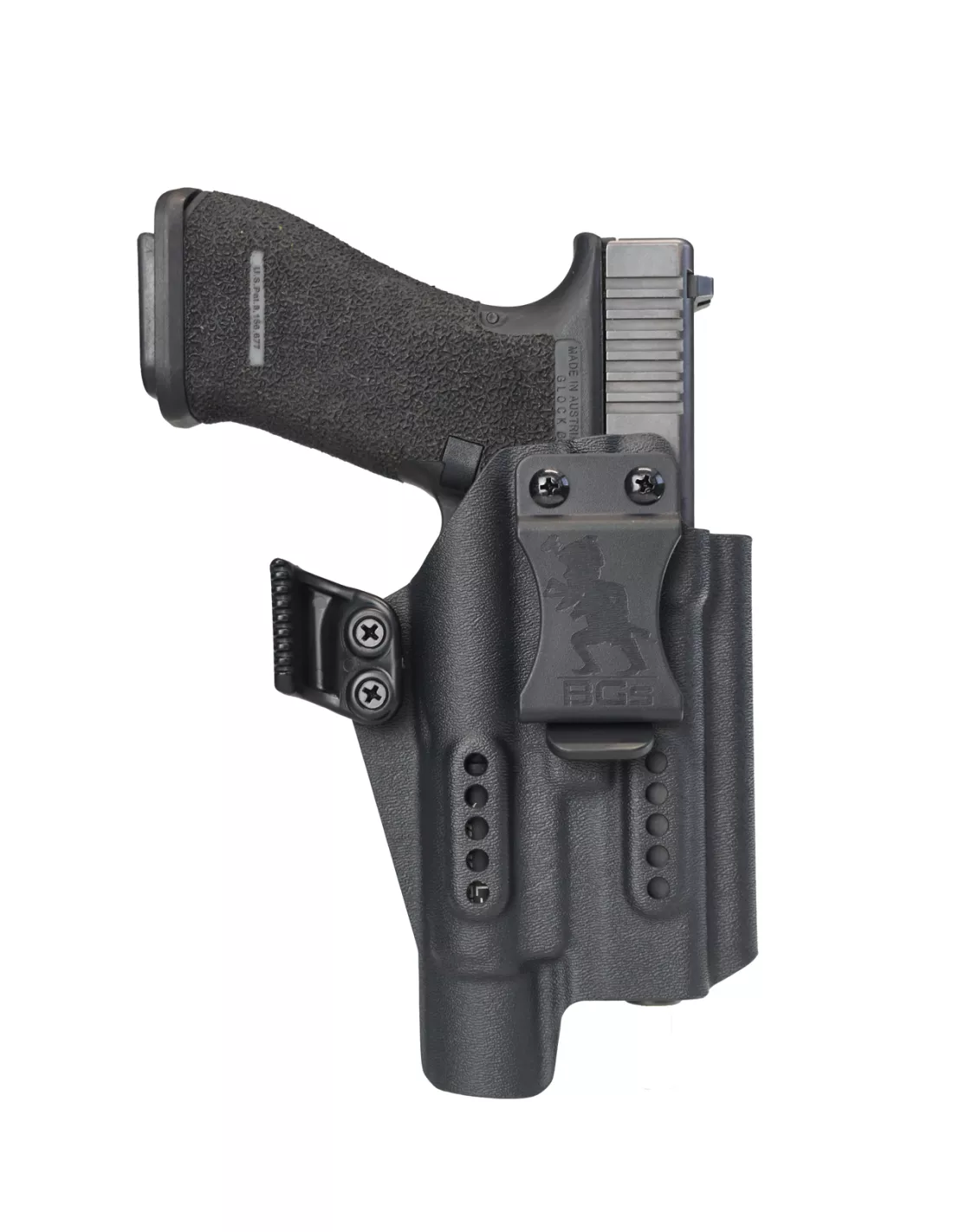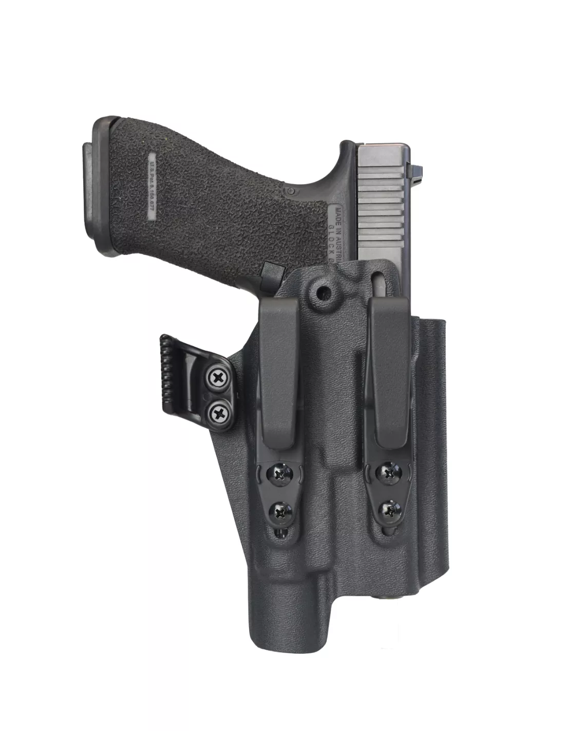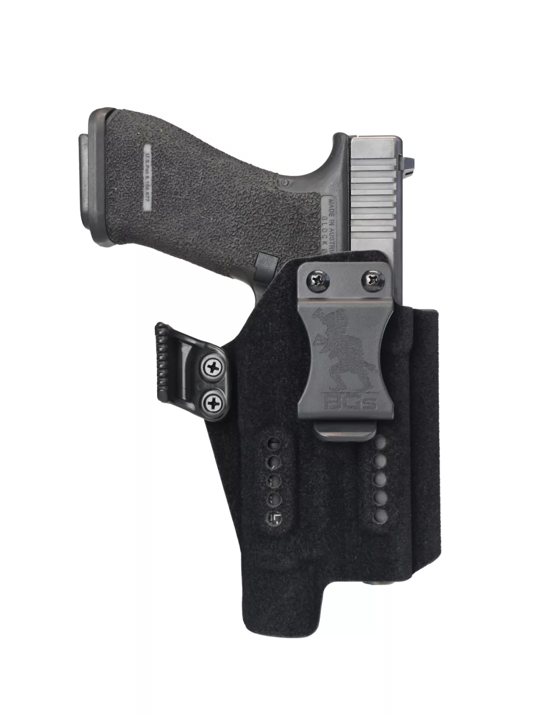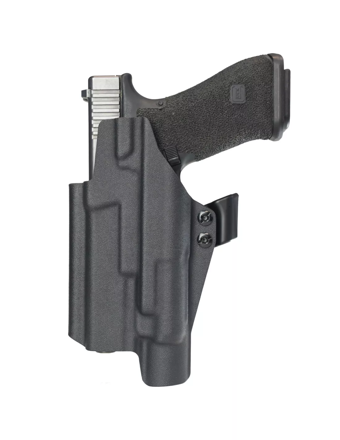 For optimal draw and security, the RETENTION IS ADJUSTABLE with the two screws on the front of the holster.