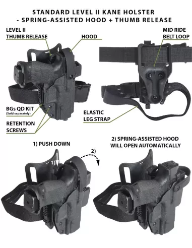The standard LEVEL II retention system combines a spring-assisted hood with an ergonomic thumb release for fast and natural operation without breaking the grip.