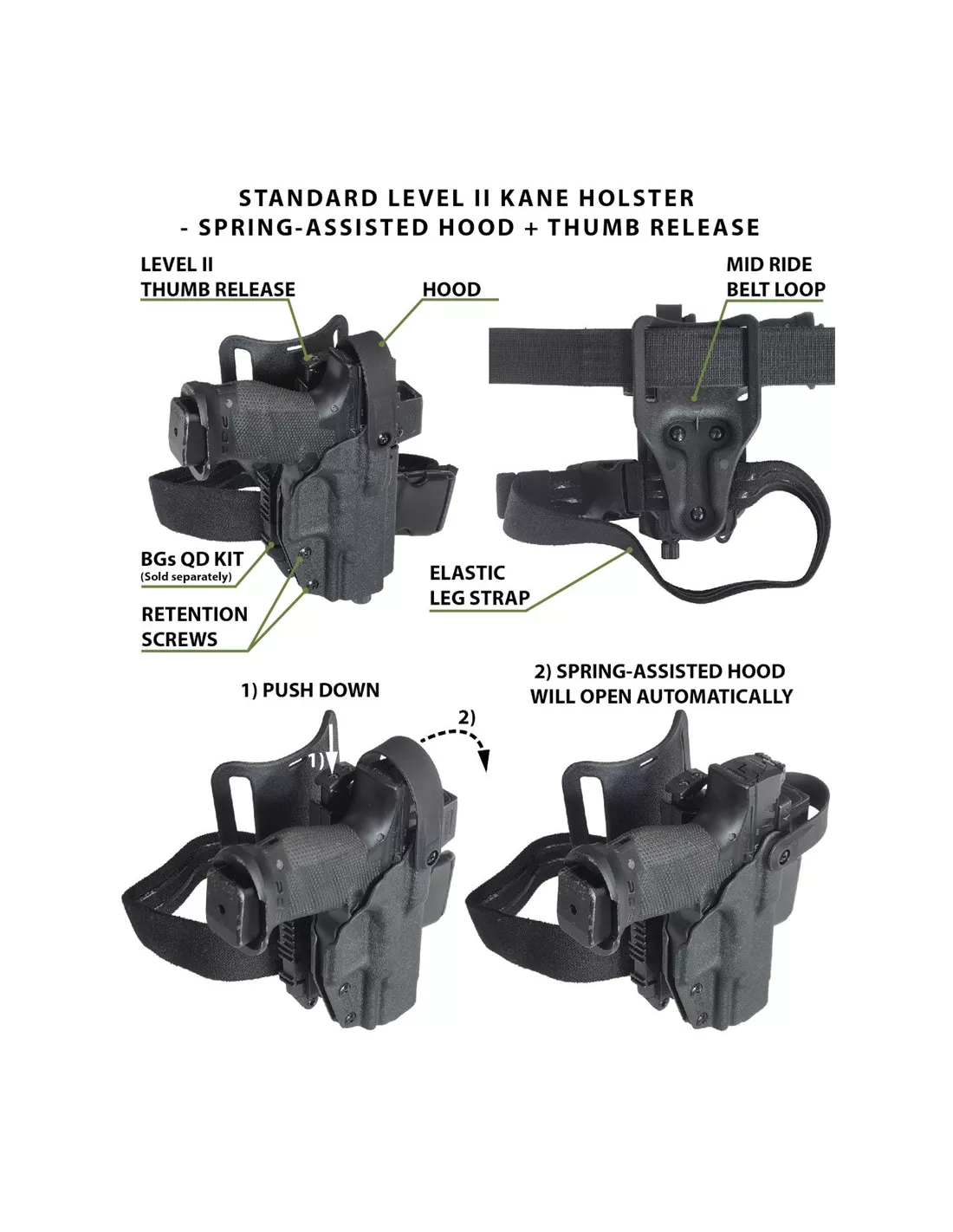 The standard LEVEL II retention system combines a spring-assisted hood with an ergonomic thumb release for fast and natural operation without breaking the grip.