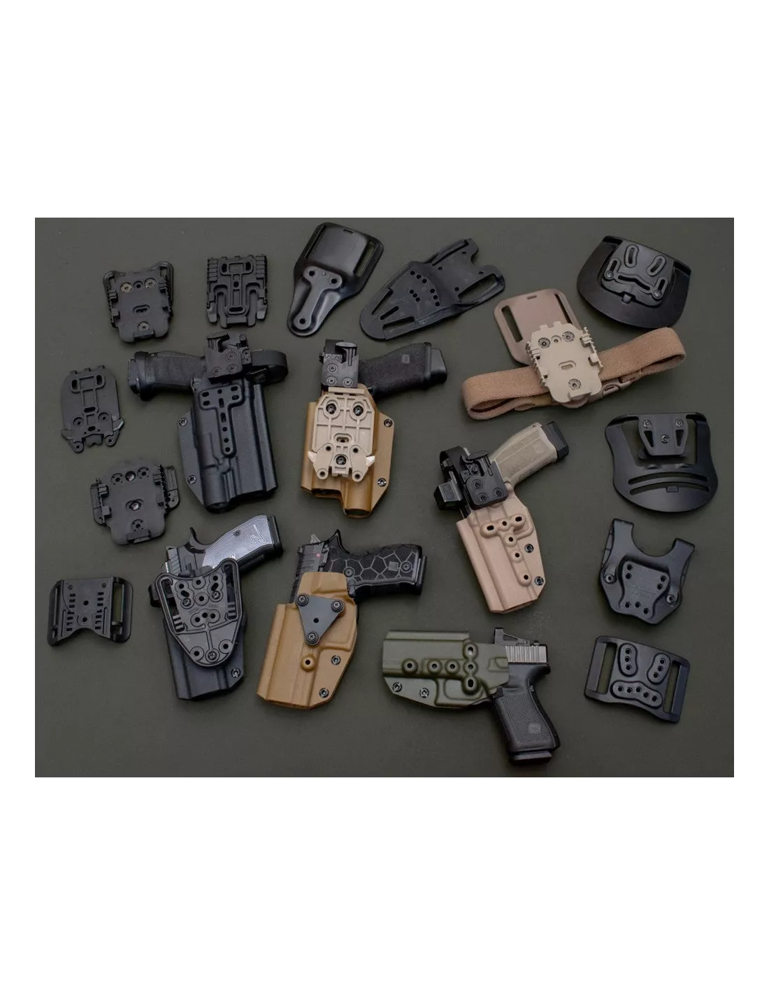 All our holsters also feature a UNIVERSAL MOUNTING HOLE PATTERN, which will fit most of the popular belt attachments on the market, such as those produced by Blackhawk, Safariland, G-Code, Bladetech etc.