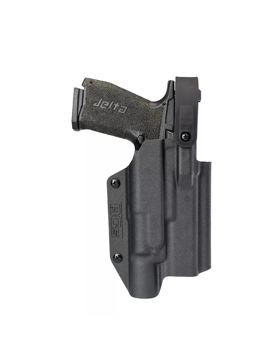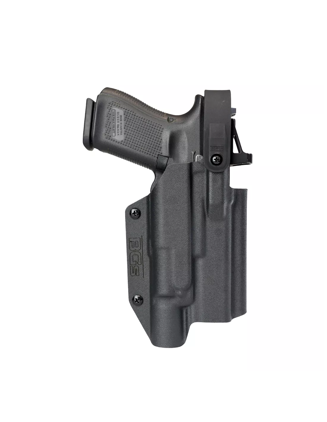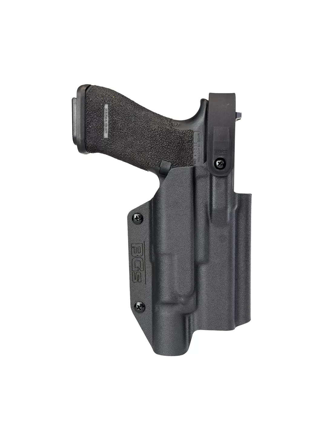 "Battle Gnome Solutions Kane is a DUTY HOLSTER designed for professional use, available in standard LEVEL II or upgraded HYBRID LEVEL III configuration. Holsters are precision made by vacuum forming Kydex T on CNC machined molds and are designed to be compatible with:
