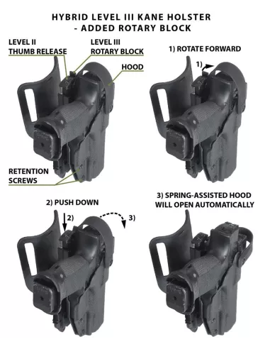 The HYBRID LEVEL III system builds on the same hood and Level II thumb release, adding a rotary blocking lever for enhanced retention during high-impact activity or attempted unauthorized access.