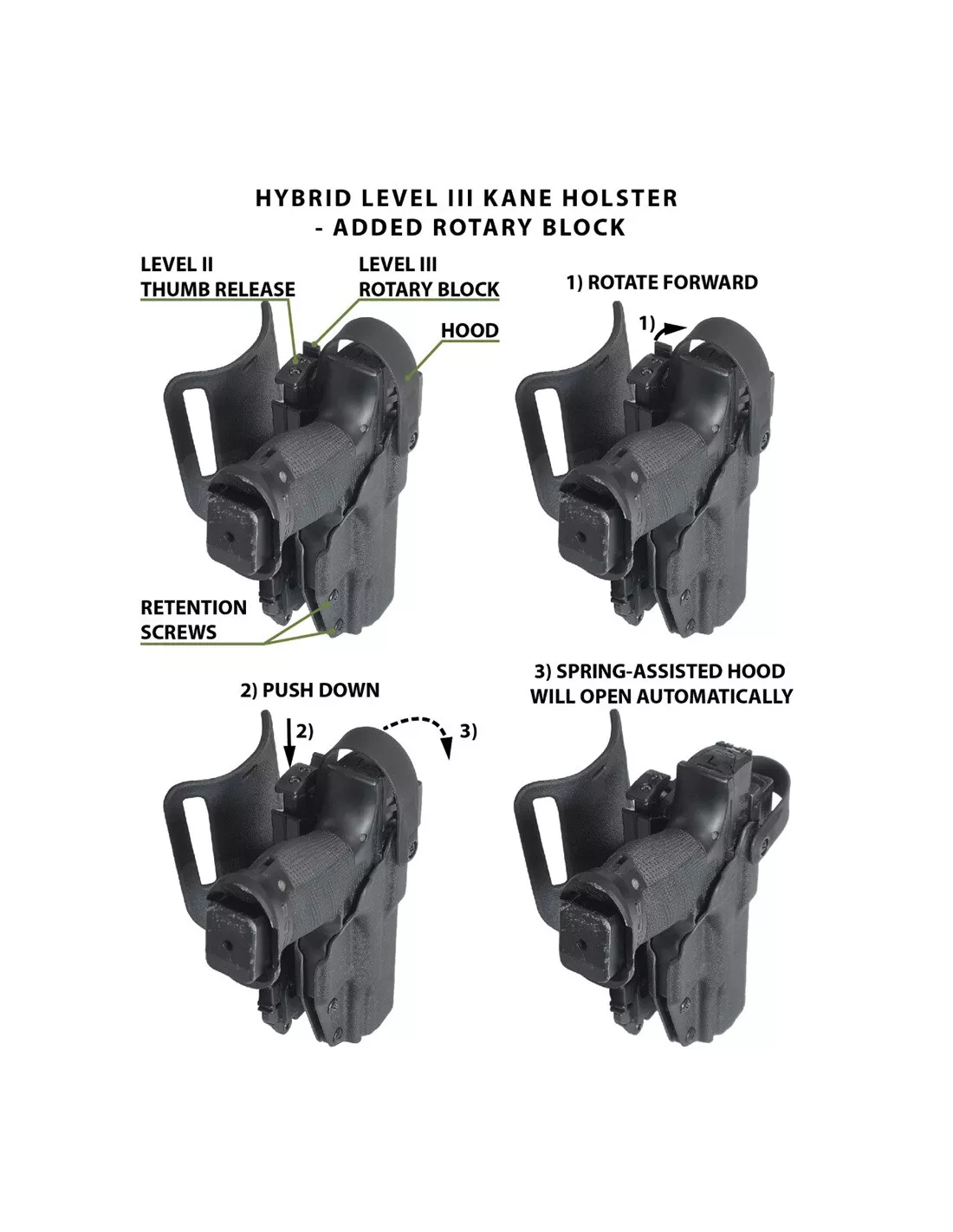 The standard LEVEL II retention system combines a spring-assisted hood with an ergonomic thumb release for fast and natural operation without breaking the grip.