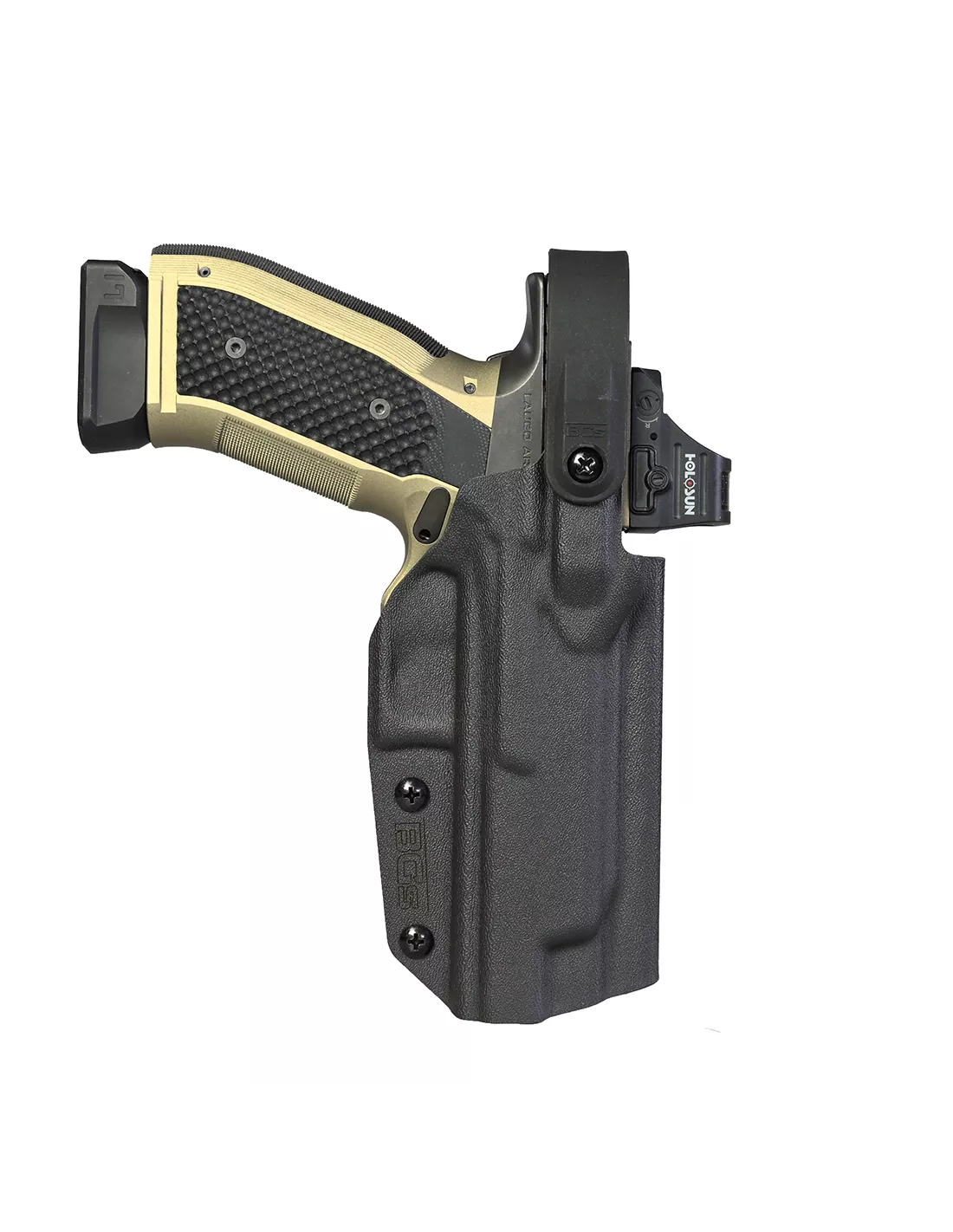 "Battle Gnome Solutions Kane is a DUTY HOLSTER designed for professional use, available in standard LEVEL II or upgraded HYBRID LEVEL III configuration. Holsters are precision made by vacuum forming Kydex T on CNC machined molds and are designed to be compatible with: