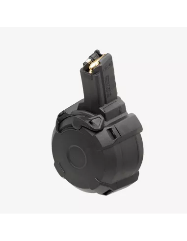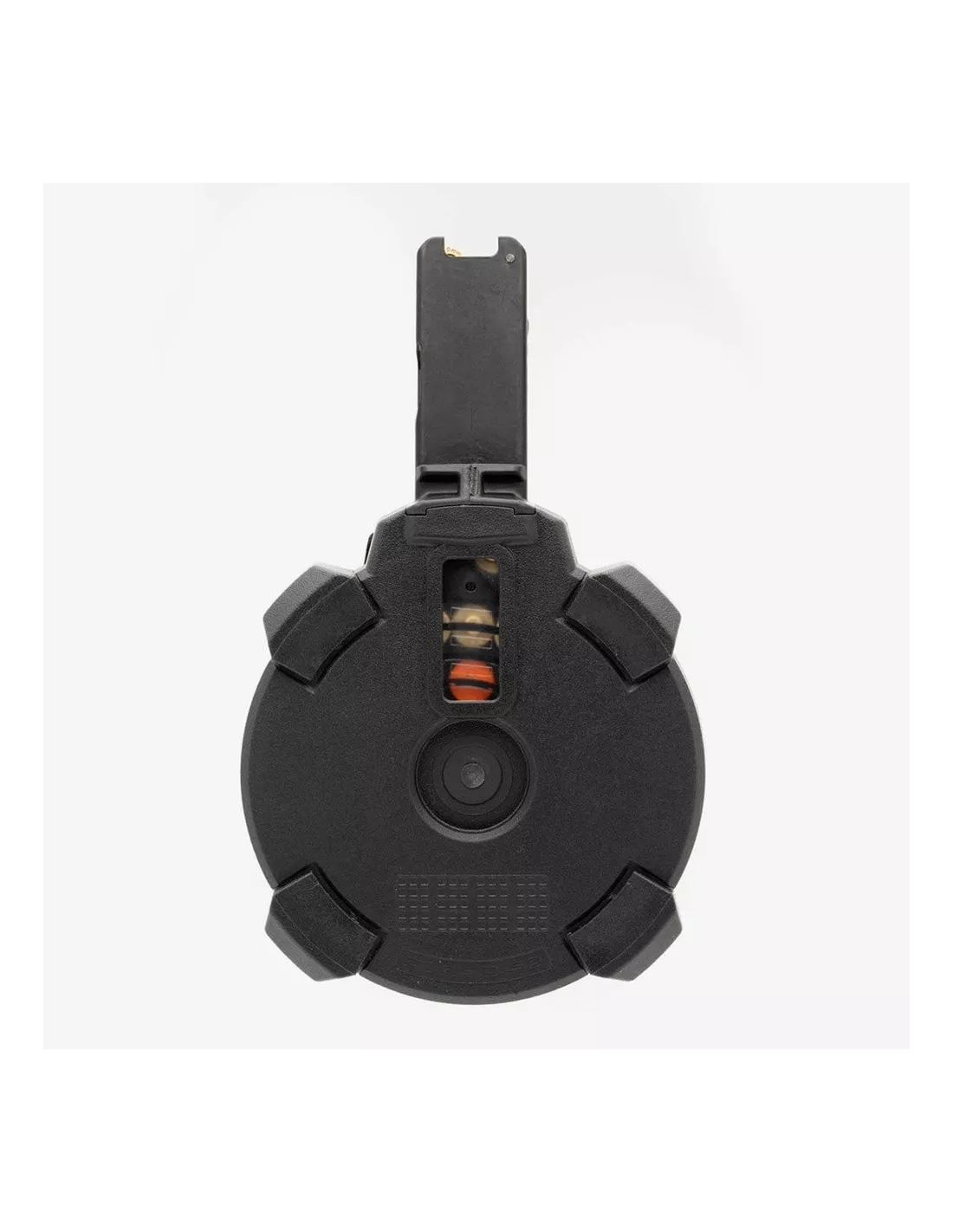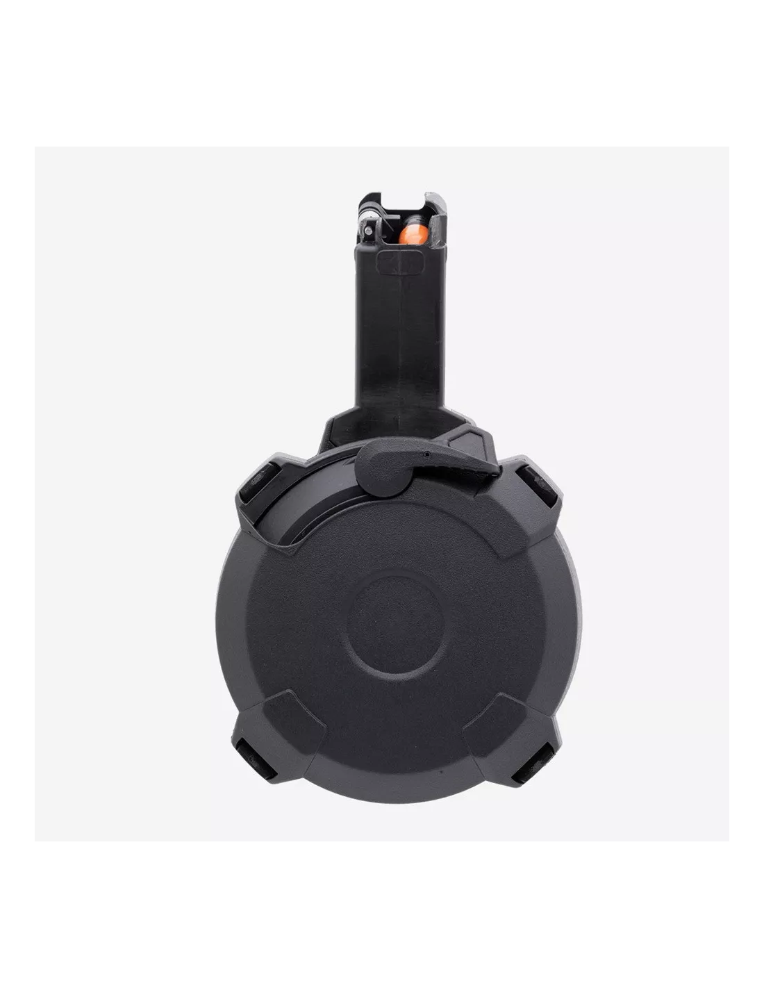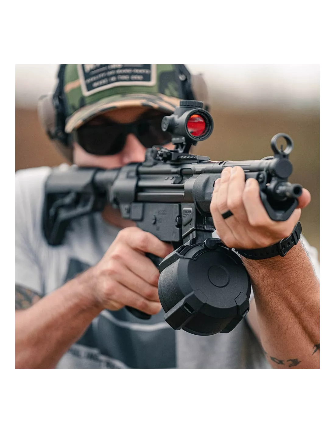 The PMAG D-50 MP provides a 50-round capacity for 9mm double-stack HK94/MP5 and other HK-style platforms. Its compact drum design minimizes protrusion below the magwell, improving handling and maneuverability. It also integrates proven Magpul drum features for easy loading, quick round count visibility, and consistent, reliable performance.