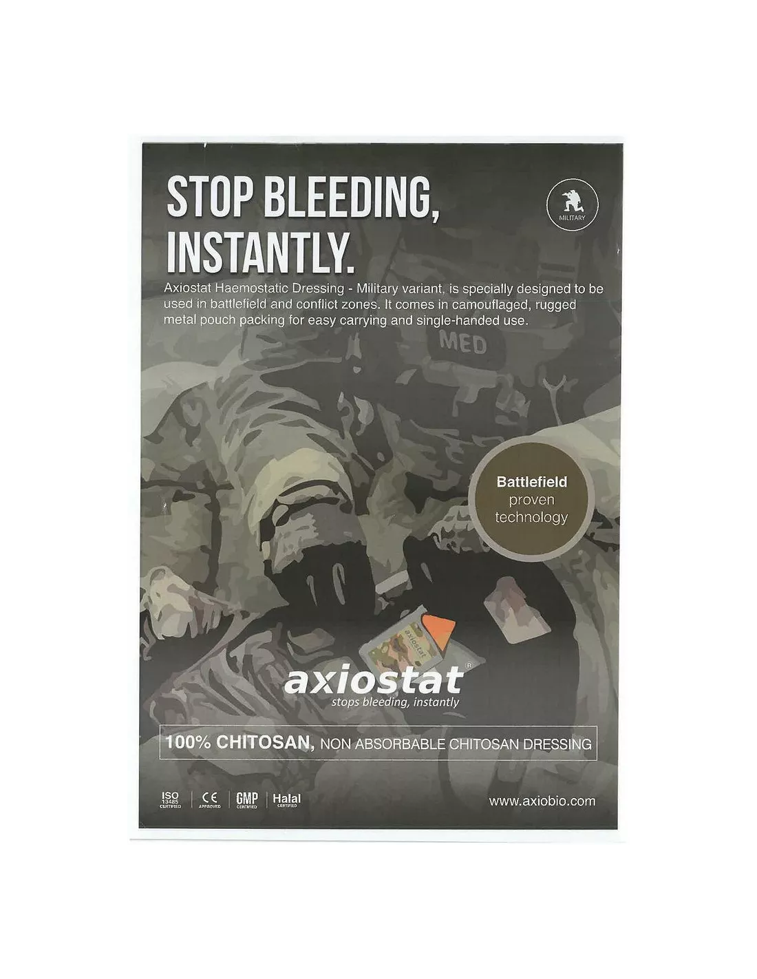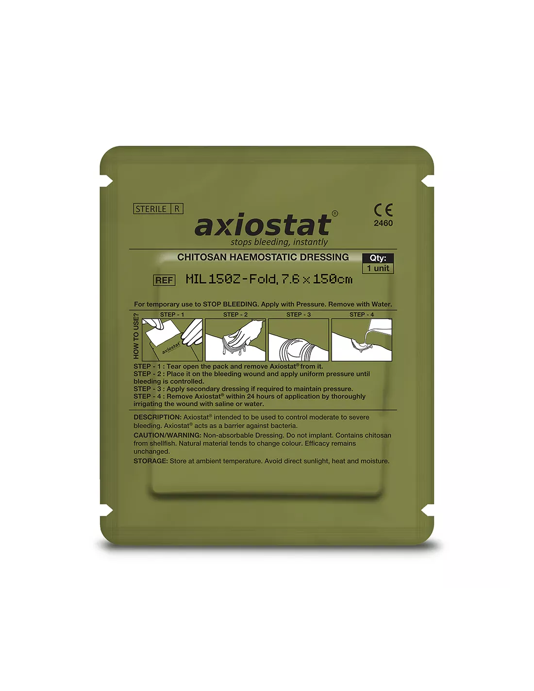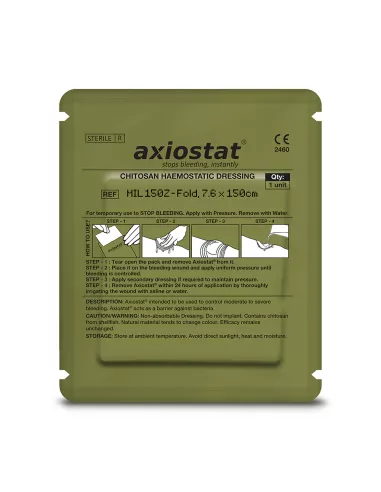 Vacuum-sealed, lightweight and compact, Axiostat Z-Fold fits easily into individual first aid kits, range and duty med kits, vehicle trauma kits or workplace bleed control kits. The sterile tear-open packaging enables fast access when seconds count.