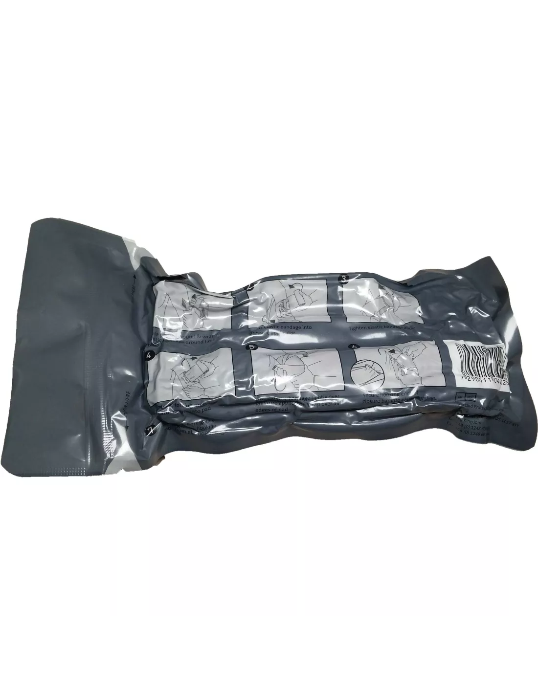 The bandage has a built-in pressure bar, which allows the soldier to twist the bandage around the wound once, and then change the direction of the bandage, wrapping it around the limb or body part, to create pressure on the wound.