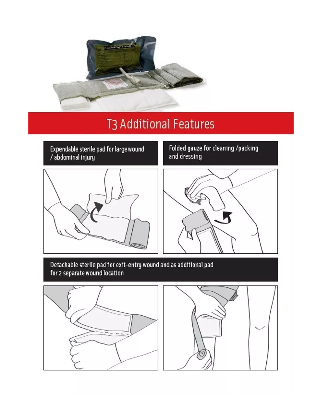 The T3 Bandage features a fully expandable and detachable large sterile dressing pad, and elasticized cloth leader, an easy to use closure bar and an extractable gauze for cleaning/packaging and secondary wound dressing.