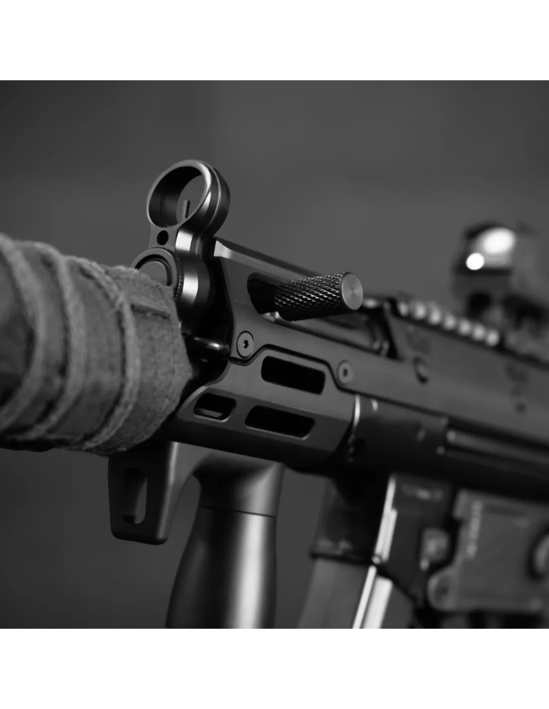 The extended 1-inch knurled handle provides a more secure, non-slip grip, making weapon manipulation faster and easier, especially during dynamic handling or when using additional accessories. It is specifically optimized for use with UTG PRO® monolithic M-LOK® handguards, making it an ideal choice for users looking to enhance both ergonomics and compatibility on their MP5-pattern platform.