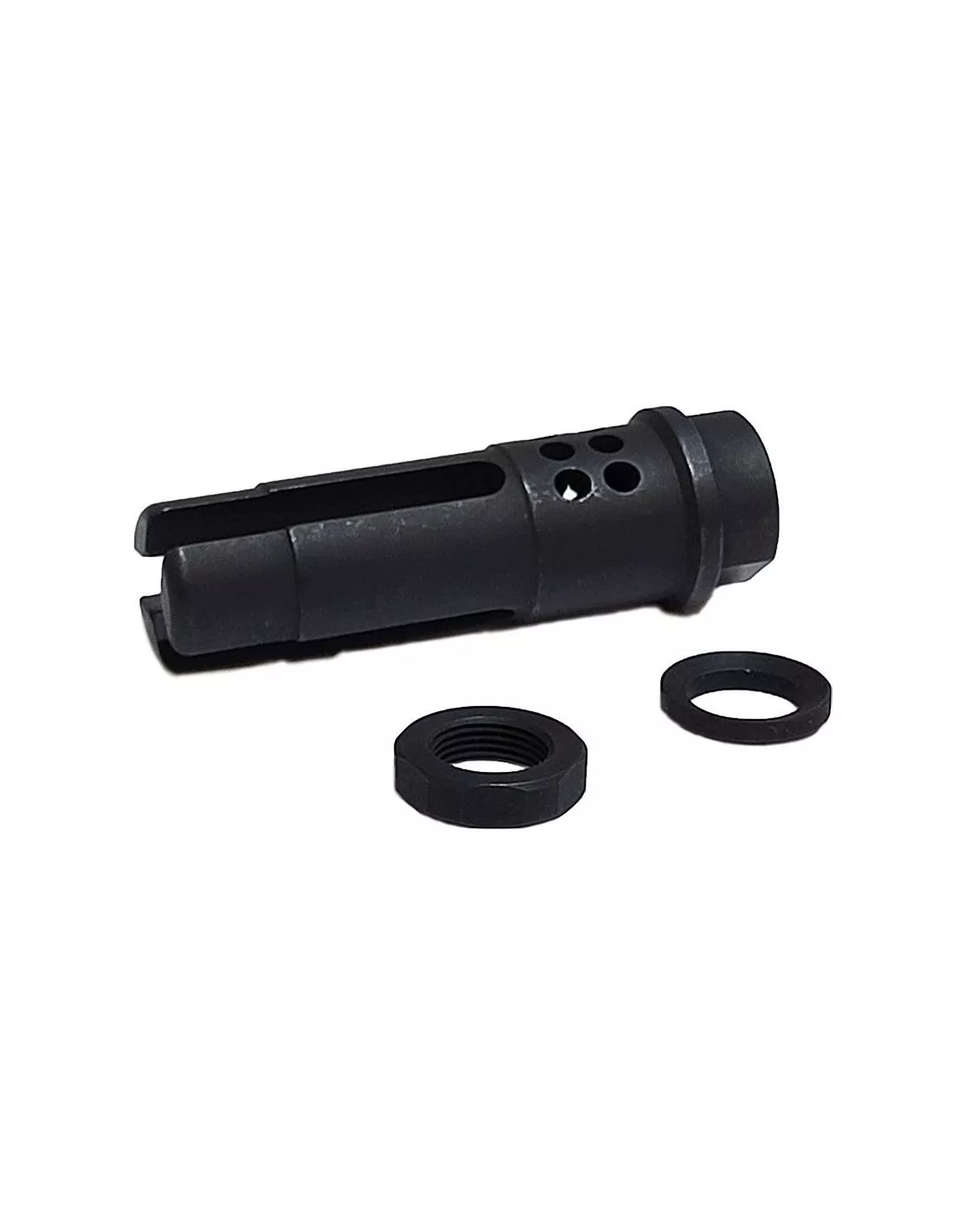 A flash hider with ports on the upper side and 3 prongs. Suitable for .223 caliber.