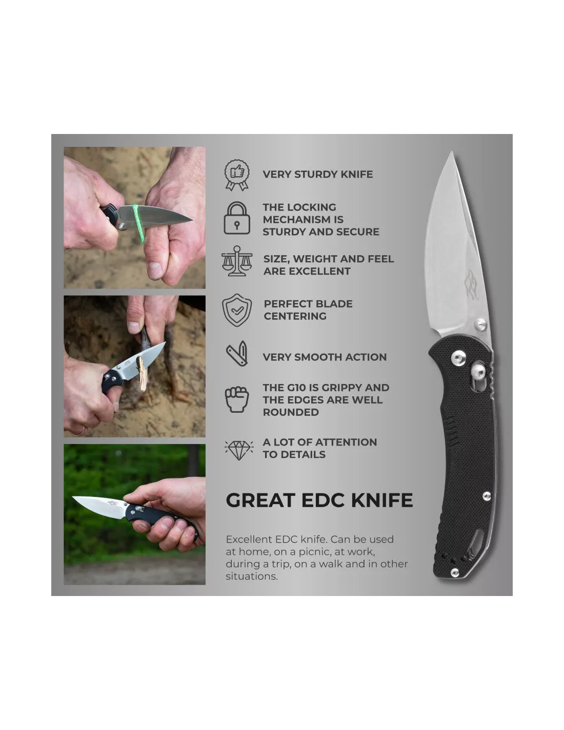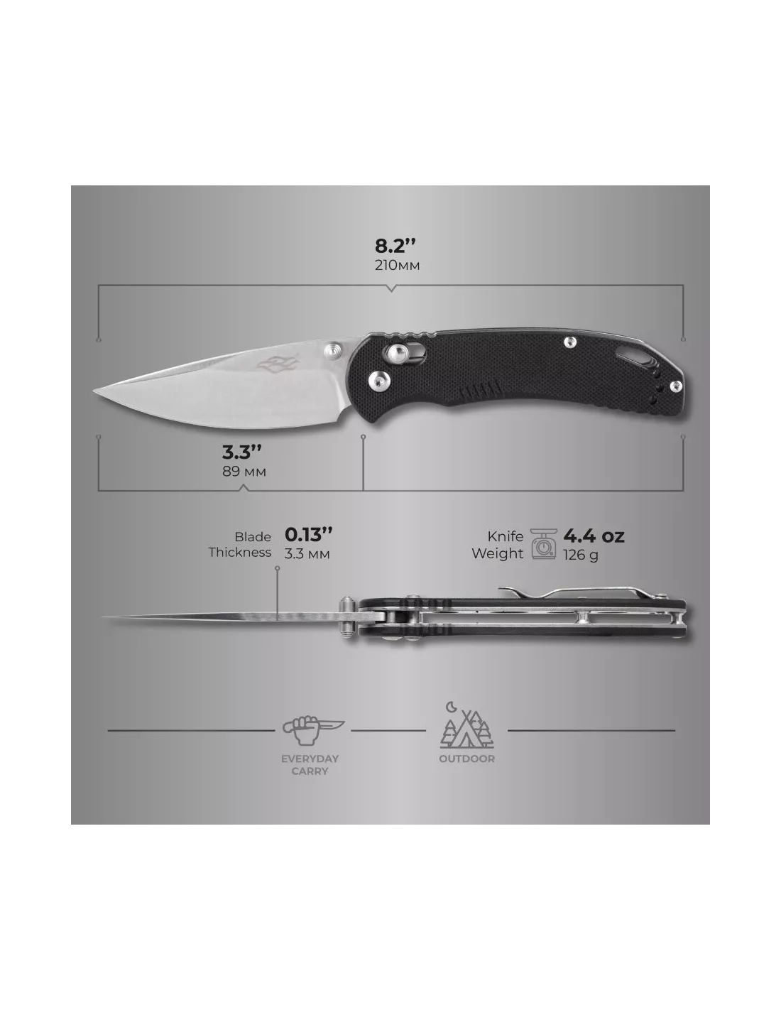 The heart of the knife is a heavy-duty, wear-resistant D2 grade steel. A corrosion-proof metal alloy shows high hardness. The hardness value of the knife is about 60 units by the Rockwell scale, which is very good for this type of product. The type of sharpening is direct. The length of the blade is eight and a half centimeters, the thickness – three and a half millimeters. The model is foldable; the blade can be got off with the help of a convenient Flipper lock. The Skimen is reliably protected against accidental opening or closing. It is safe to use and has a convenient design. The total length of the product is only 20.5 centimeters. Such compact dimensions give an advantage to the knife for everyday use. It can be easily put in a bag or pocket and used as needed, the model is always at hand.